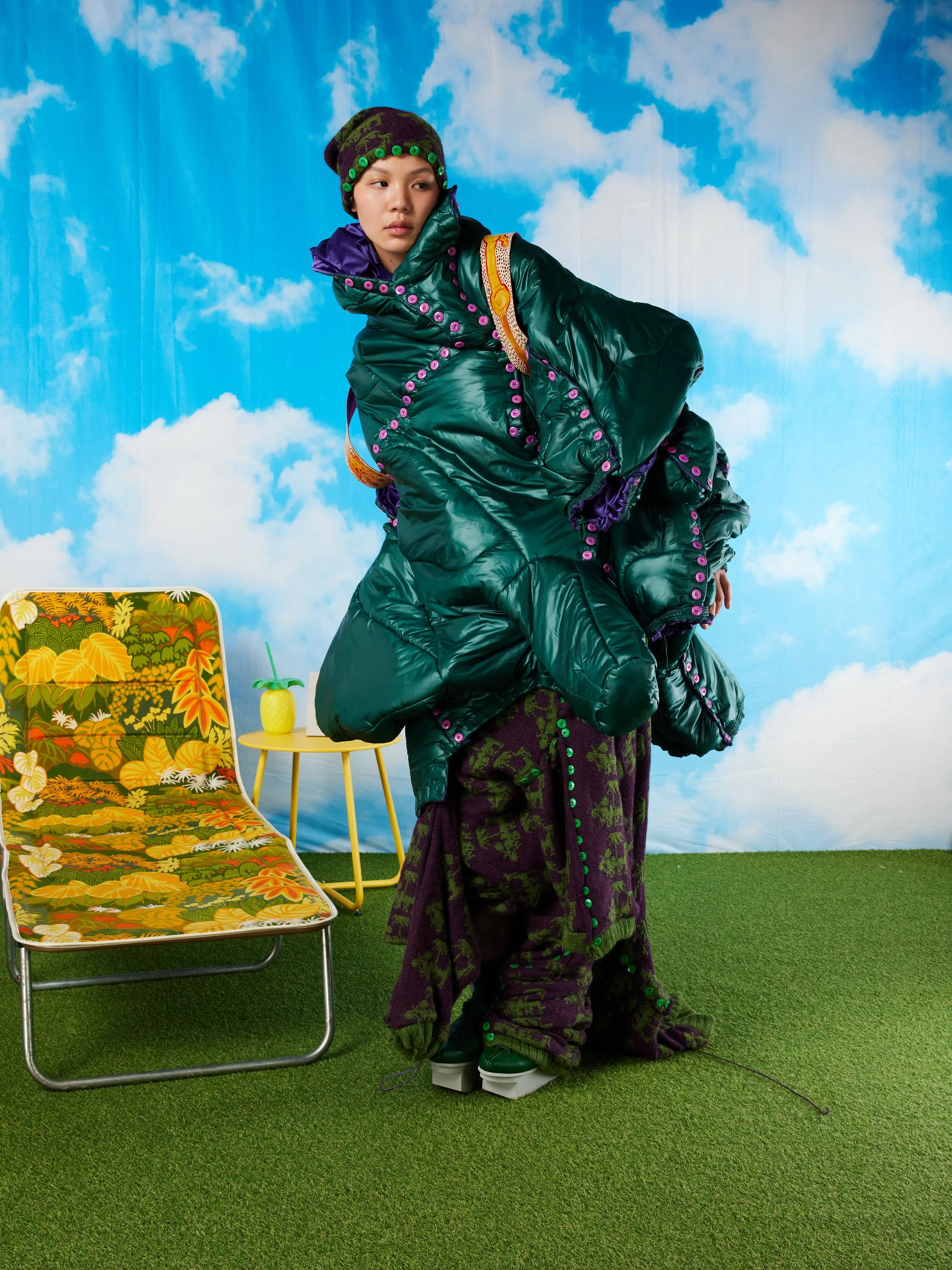 It’s made of 100% alpaca and loads of green buttons. You can adjust it as you like…